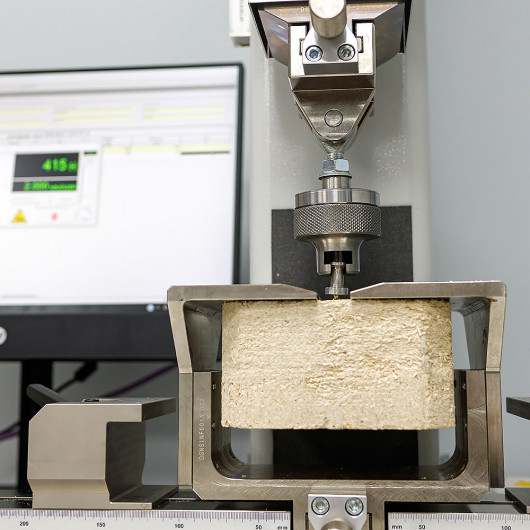 Ahşap karışımını palet bloklarını gördüğümüz kirişlere bastırıyoruz. Tüm palet bloklarının hacmini ve ağırlığını kontrol ediyoruz ve rastgele bir su emilimi ve çivi testi gerçekleştiriyoruz.